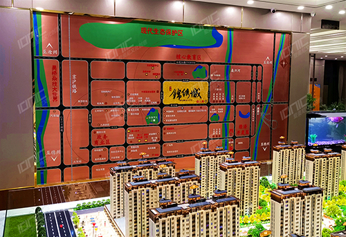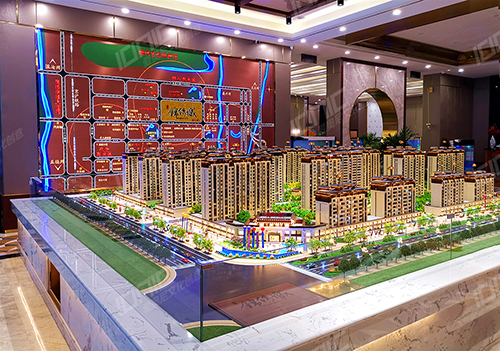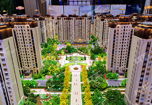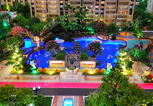 小區(qū)內(nèi)部景觀遵循五重綠化工藝設(shè)計(jì),不同的場景布置不同的樹種,各色各樣的綠植,高低錯(cuò)落,非常有層次感。水面采用仿真水制作,路面采用UV打印制作,使得鋪裝逼真,色彩素雅,映襯沙盤更加閃耀奪目。