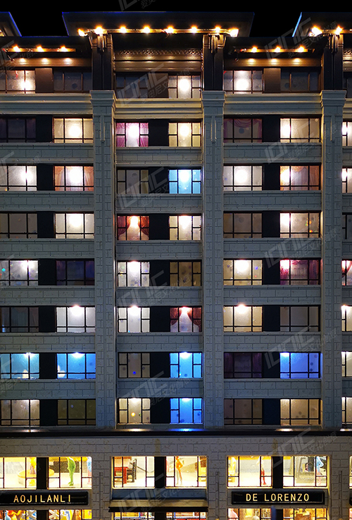 建筑窗戶使用半透明有機(jī)玻璃激光雕刻,不僅可以展現(xiàn)出細(xì)致的凹凸窗線和玻璃質(zhì)感,還可以看到里面的窗簾等裝飾。